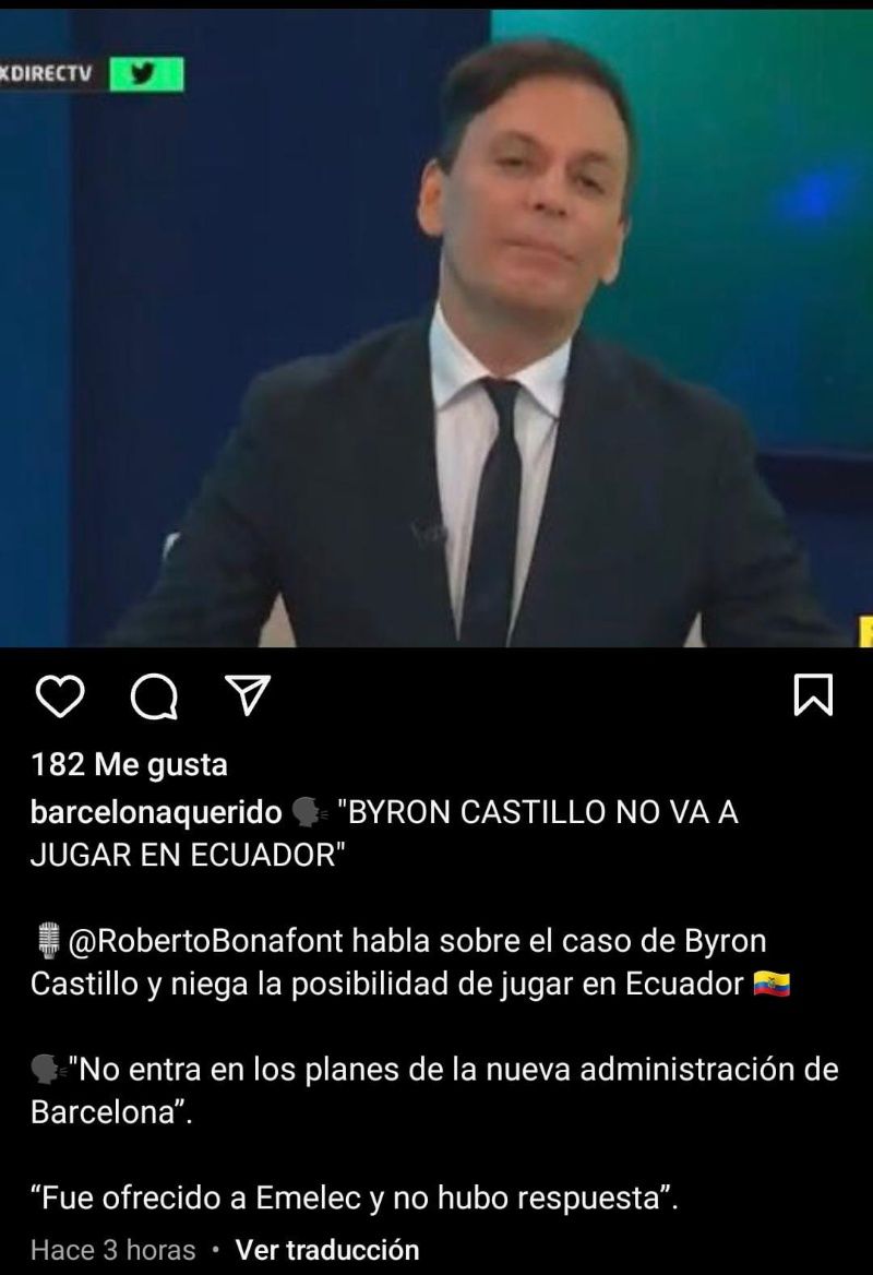Así mismo, comentó que Byron Castillo “Fue ofrecido a Emelec y no hubo respuesta”, asegurando que el regreso del jugador al país no se daría. Por lo que el equipo de Barcelona SC, buscaría un jugador que ocupe esa posición en el campo de juego para el 2024.