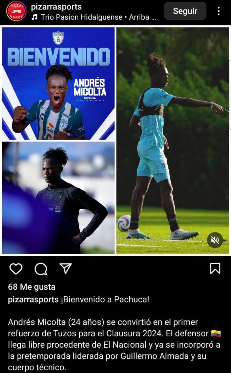 Se trata del defensor central ecuatoriano Andrés Micolta, quien hace varias semanas fue vinculado con una posible llegada al equipo de Barcelona SC, pero que no llegaría. Esto debido a que en la mañana de hoy, en las cuentas oficiales del Grupo Pachuca, anunciaron la contratación del futbolista. Siendo este otro de los fichajes que se le habrían escapado al equipo de los canarios para la temporada 2024.