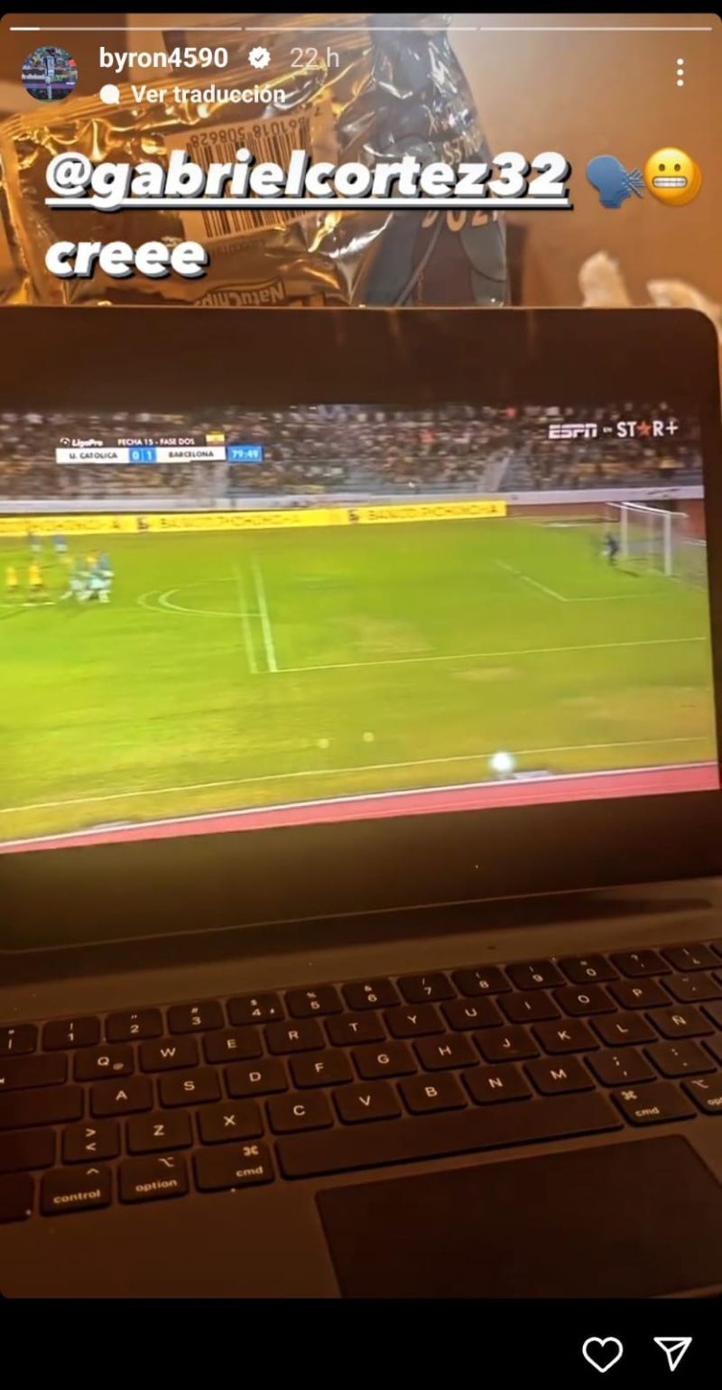 Byron Castillo, ex jugador de Barcelona SC, no fue ajeno al gol de Cortez y desde su cuenta de Instagram reaccionó al gol que le otorgó el segundo lugar a los ‘toreros’. El también jugador de la selección ecuatoriana publicó una historia grabando el gol y etiquetando al ‘Loco’ junto con la frase “creee”. Sin duda, el futbolista se unió al festejo de la hinchada amarilla.