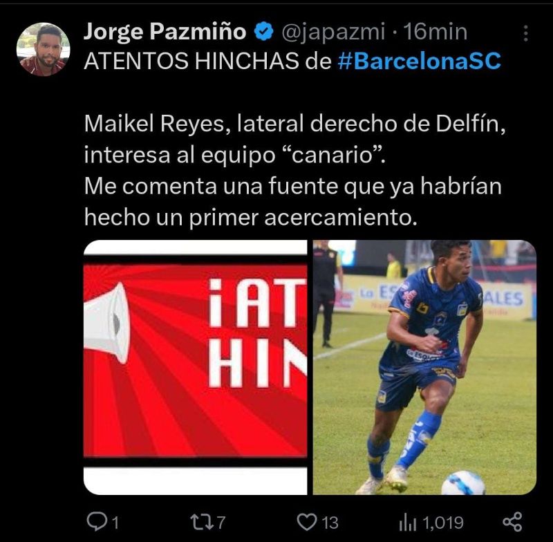 Esto al publicar en la red social X, que, “Maikel Reyes, lateral derecho de Delfín SC, interesa al equipo ‘canario’. Me comenta una fuente que ya habrían hecho un primer acercamiento”.