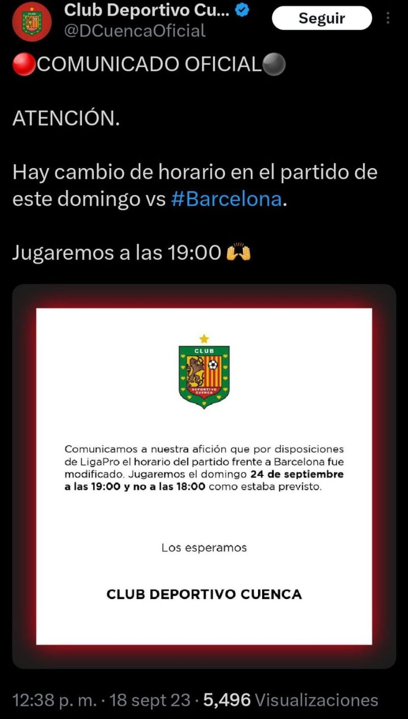 Esto se pudo conocer, tras un comunicado oficial que fue emitido por parte de las redes sociales oficiales del equipo del Deportivo Cuenca. El mismo que dice “Comunicamos a nuestra afición que por disposiciones de LigaPro el horario del partido frente a Barcelona SC fue modificado. Jugaremos el domingo 24 de septiembre a las 19:00 y no a las 18_00 como estaba previsto”.
