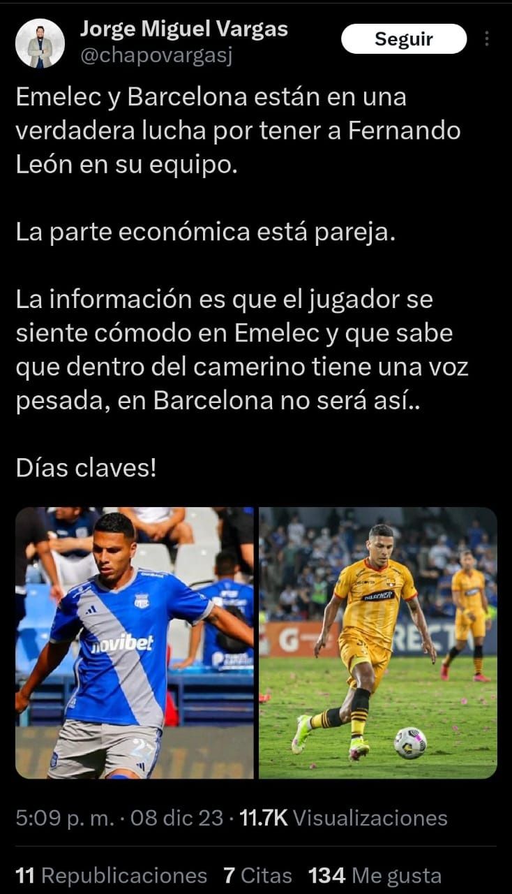 Tras el rumor de que el regreso de Luis Fernando León a Barcelona SC no se terminaría de cerrar, se han mencionado las razones por las que se complicaría su llegada al ídolo. Pues según el periodista Jorge Miguel Vargas, “Emelec y Barcelona SC están en una verdadera lucha por tener a Fernando León en su equipo. La parte económica está pareja. La información es que el jugador se siente cómodo en Emelec y que se sabe que dentro del camerino tiene una vez pesada, en Barcelona SC no será así”.