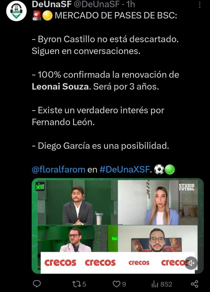 Por lo que Leonai Souza seguirá vistiendo los colores del equipo de los toreros hasta finales del año 2026, cuando culmine su nuevo contrato con BSC. De igual manera, comentó que el futbolista Byron Castillo sigue estando en los planes de jugadores a contratarse para el próximo año en Barcelona SC.