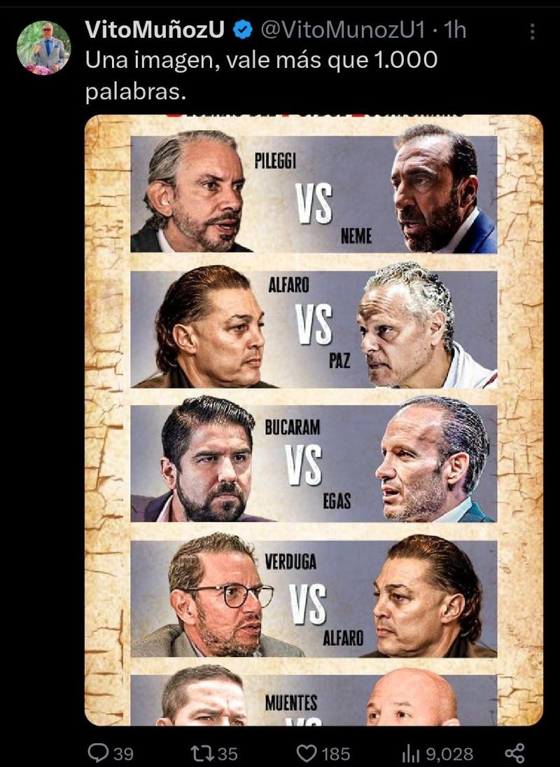 Sobre este tema, se ha pronunciado Vito Muñoz, uno de los periodistas que está involucrado en el mundo del fútbol ecuatoriano, principalmente en Barcelona SC. Quien ha señalado al presidente canario como uno de los más conflictivos, al realizar una publicación en la red social X. En donde escribió “Una imagen, vale más que 1000 palabras”, adjuntando una imagen que señala a ambos directivos que han protagonizado una serie de debates sobre el arbitraje.