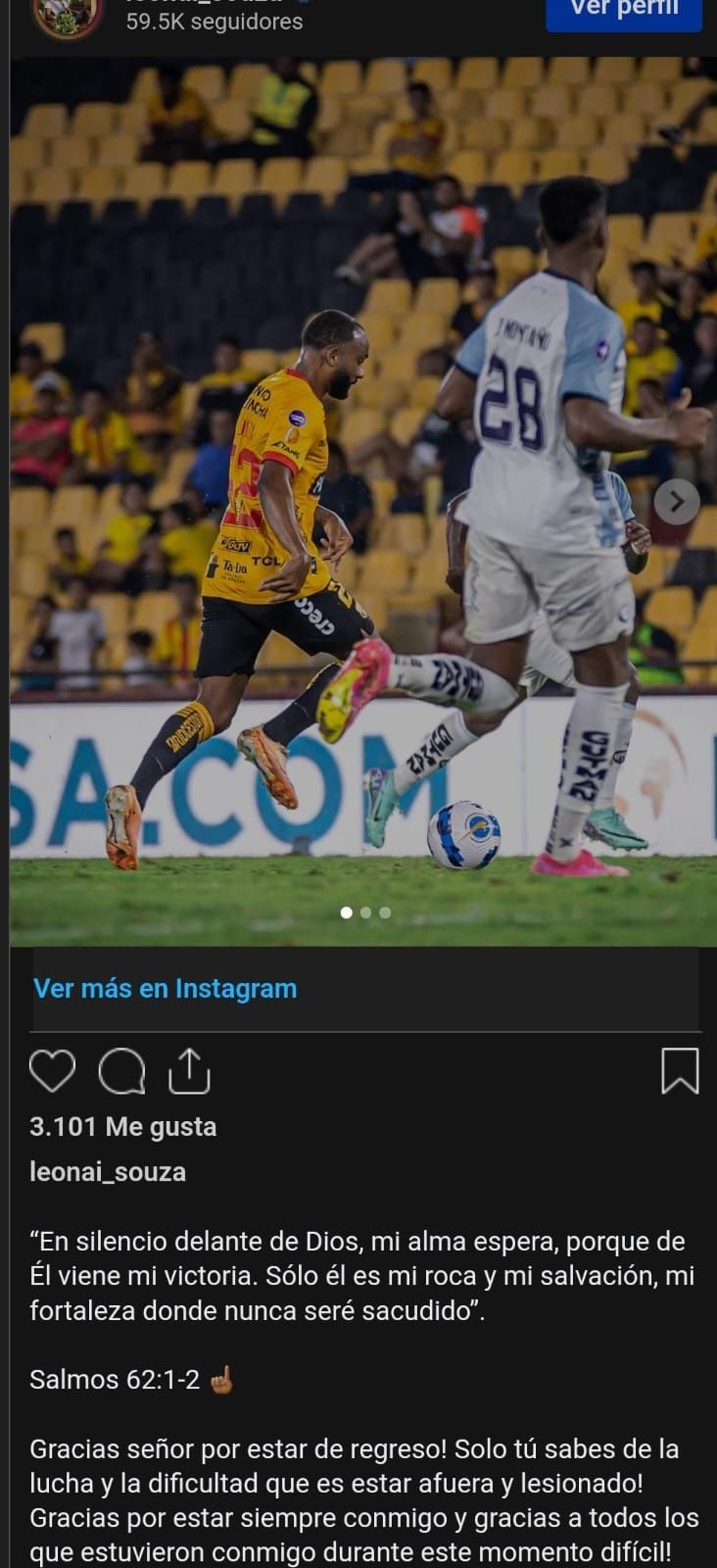Tras su regreso al campo de juego, el mediocampista brasileño Leonai Souza publicó en sus redes sociales un mensaje al retornar a las canchas. En donde el futbolista del equipo de Barcelona SC, escribió “Gracias señor por estar de regreso! Solo tú sabes de la lucha y la dificultad que es estar afuera y lesionado! Gracias por estar siempre conmigo y gracias a todos los que estuvieron conmigo durante este momento difícil”.